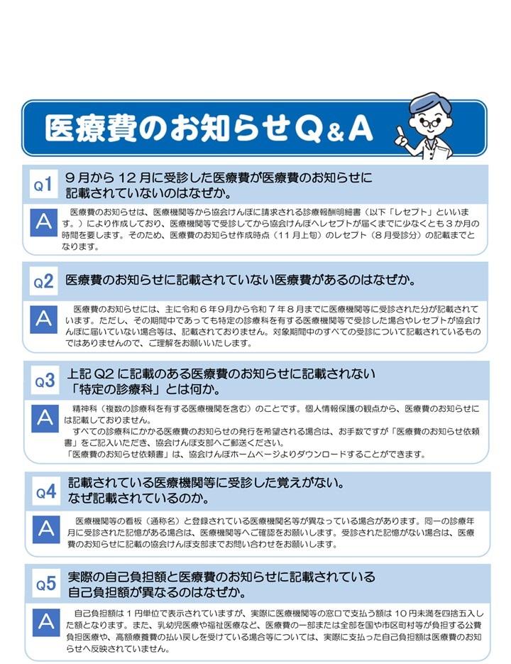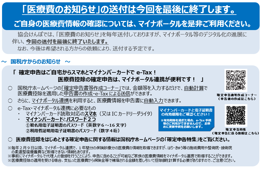 協会けんぽでは、加入者の皆様にご自身の治療等にかかった医療費について確認していただき、健康保険事業の健全な運営を図るために、年一回「医療費のお知らせ」を発行しています。