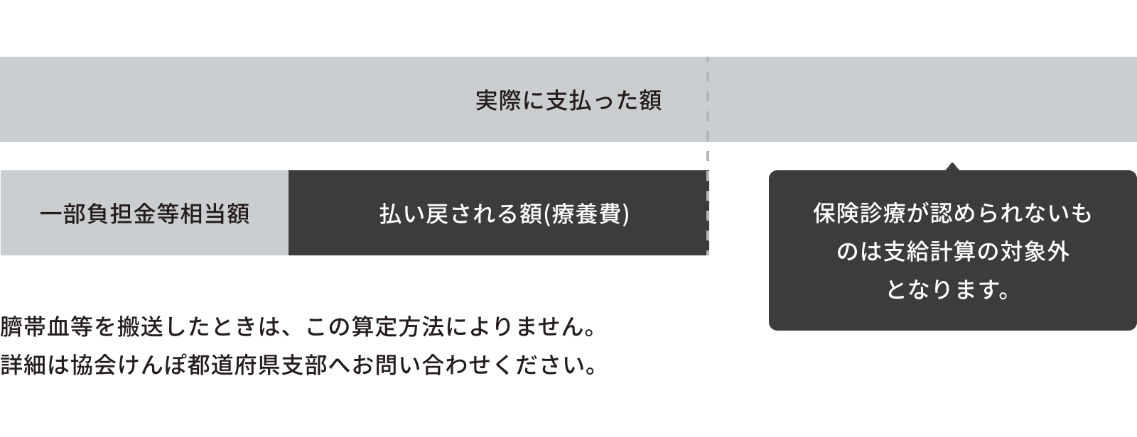 申請書に添付された診療報酬明細書等により、協会けんぽが「健康保険の療養に要する費用の算定方法(診療報酬点数表)」に基づき計算した額(実際に支払った額の方が低いときはその額)から、加入者が負担すべき額を差し引いた額が療養費として支給されます。実際に支払った額(返還した額)の中に、保険診療が認められていない処置や薬剤、病気の予防を目的とする予防注射等の費用が含まれている場合は、療養費の計算から除かれます。