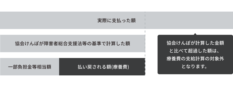 実際に支払った額が、協会けんぽが障害者総合支援法等により定められた額に基づき計算した額を超えている場合は、協会けんぽが計算した額の範囲で療養費が支給されます。