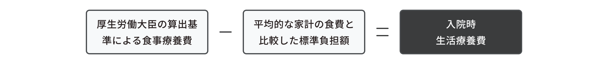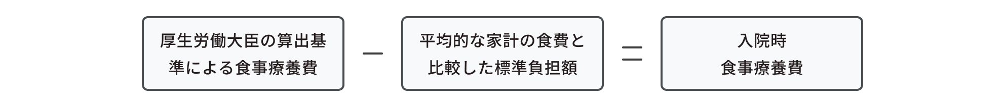 入院時食事療養費の額は、厚生労働大臣が定める基準にしたがって算出した額から平均的な家計における食事を勘案して厚生労働大臣が定める標準負担額を控除した額となっています。