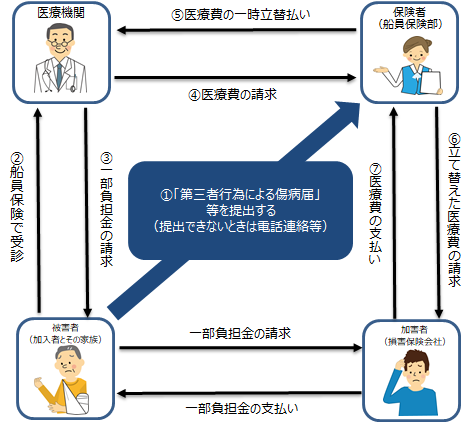 しかし、業務上や通勤災害によるものでなければ、船員保険を使って治療を受けることができますが、この場合、加害者が支払うべき治療費を船員保険が立て替えて支払うこととなります。