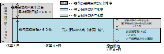 休業手当金は、労災保険の給付を上回っている船員法の災害補償部分について、船員保険から給付が行われる仕組みとなっています。