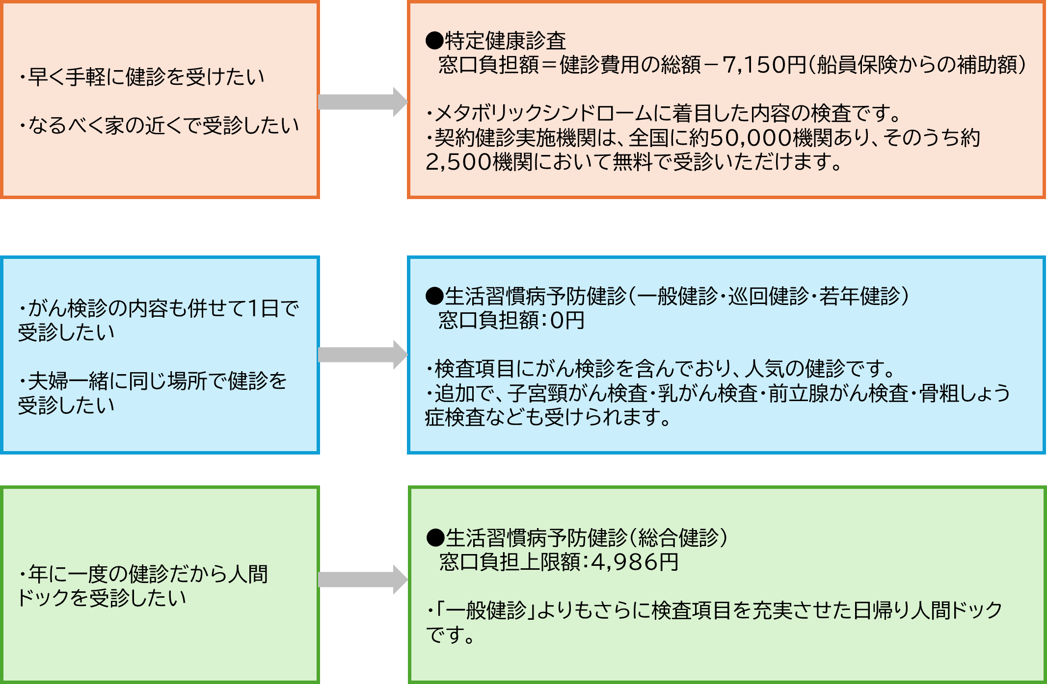 ※ 上記3つの健診のうちいずれかについて、年度中1回限り受診いただけます。(健診費用の全部または一部を船員保険が負担します)