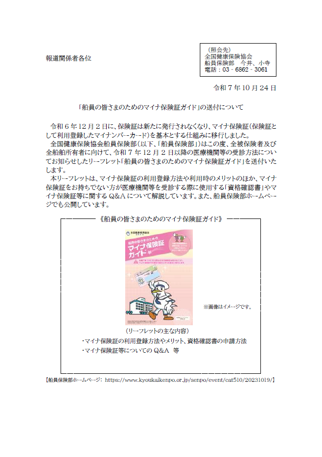 船員保険における「船員の皆さまのためのマイナ保険証ガイド」の送付について、プレスリリースを行いました。(画像クリックで拡大します)
