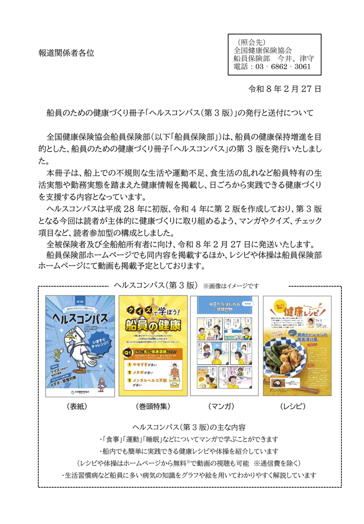 船員のための健康づくり冊子「ヘルスコンパス(第3版)」の発行と送付について、プレスリリースを行いました。