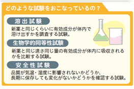 様々な試験などを実施することにより、効き目や安全性が新薬と同等であることが、国により保証されています。