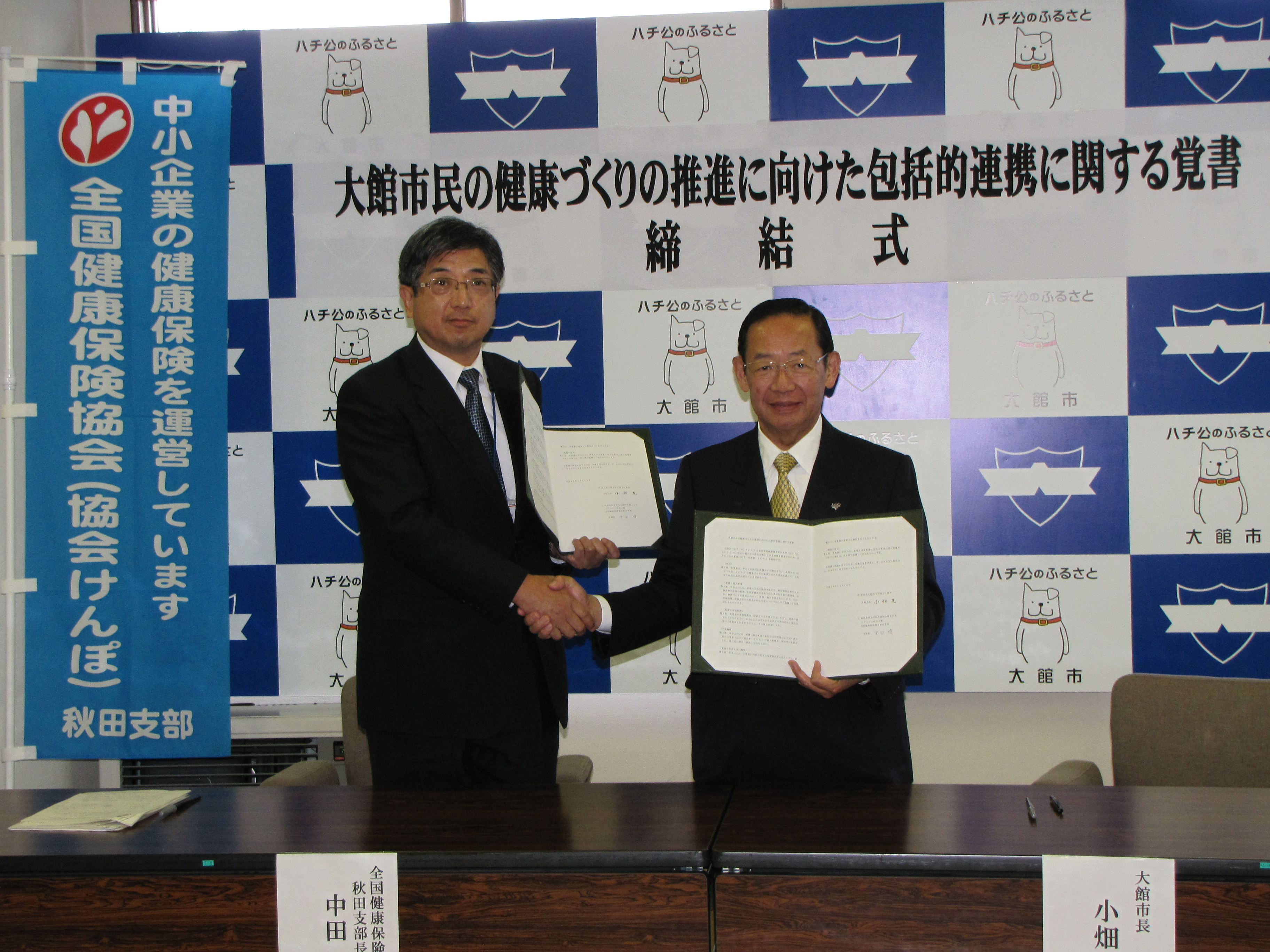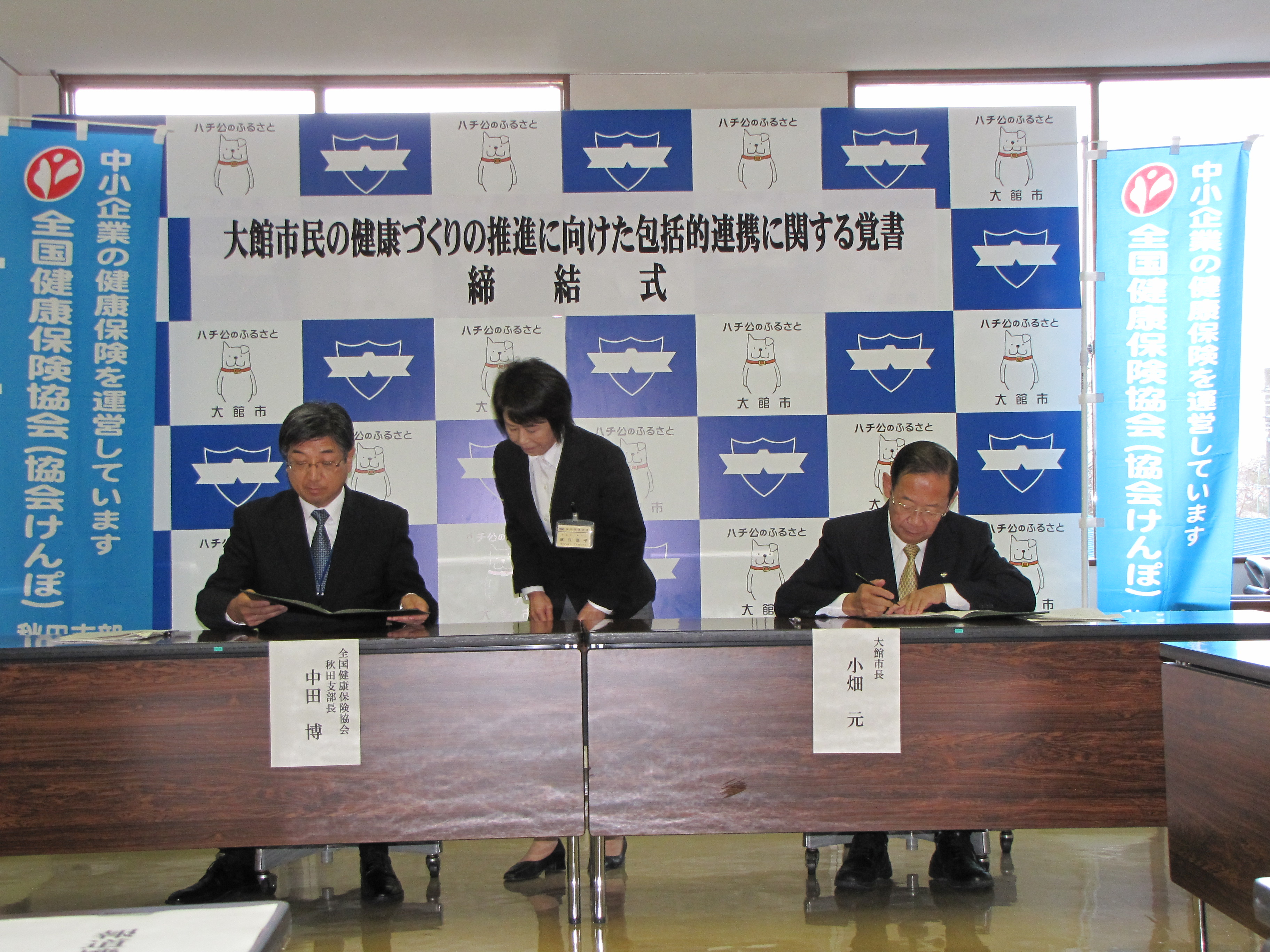 平成26年11月10日、協会けんぽ秋田支部では、大館市と健康づくりの推進に向けた包括的連携に関する覚書を締結しました。