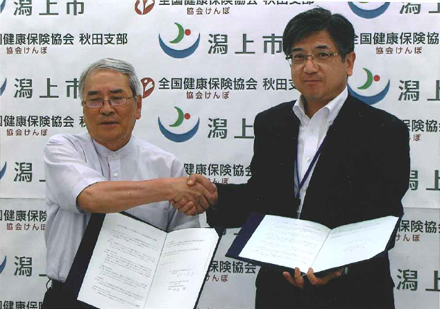 平成28年8月3日、協会けんぽ秋田支部と潟上市との間で、健康づくりの推進に向けた包括的連携に関する覚書を締結しました。