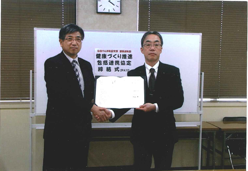 平成29年4月12日、協会けんぽ秋田支部と健康保険組合連合会秋田連合会との間で、健康づくり等の推進に向けた包括的連携に関する協定を締結しました。
