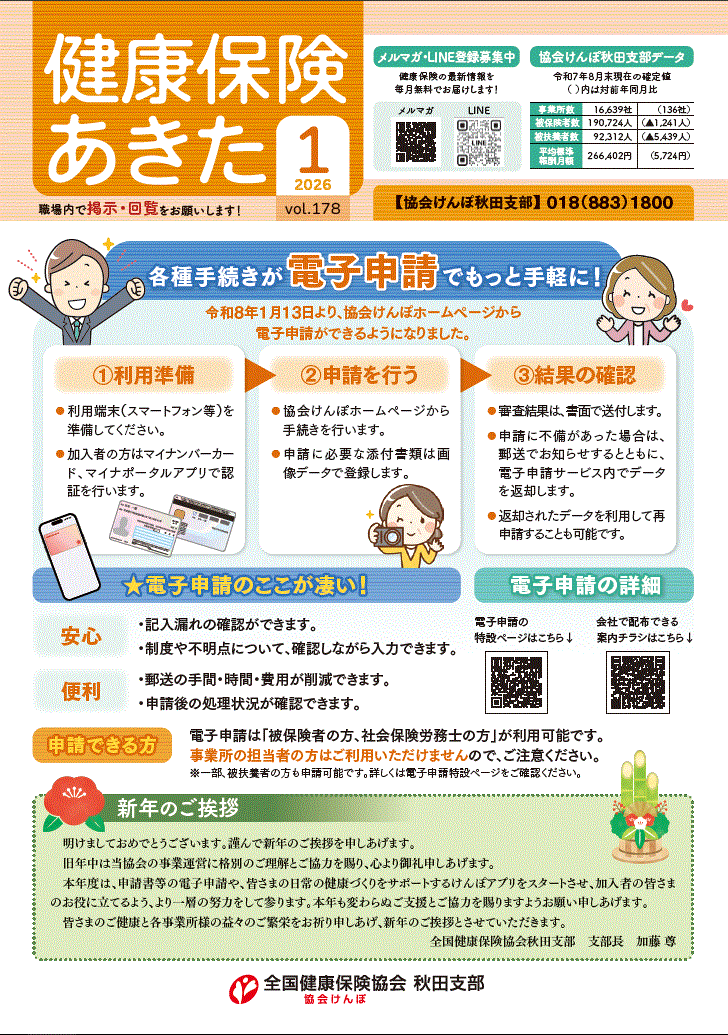 協会けんぽ秋田支部では、日本年金機構の各年金事務所がお送りしている社会保険料納入告知書に、広報誌「健康保険あきた」として健康保険事業に関するお知らせを同封しております。広く加入者の皆様にお読みいただけるようホームぺージにも掲載しますのでご覧ください。