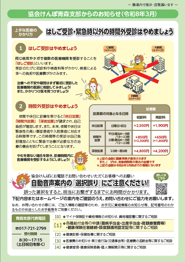 毎月20日頃に日本年金機構から発送される社会保険料納入告知書に同封している、協会けんぽ青森支部作成のリーフレットです。