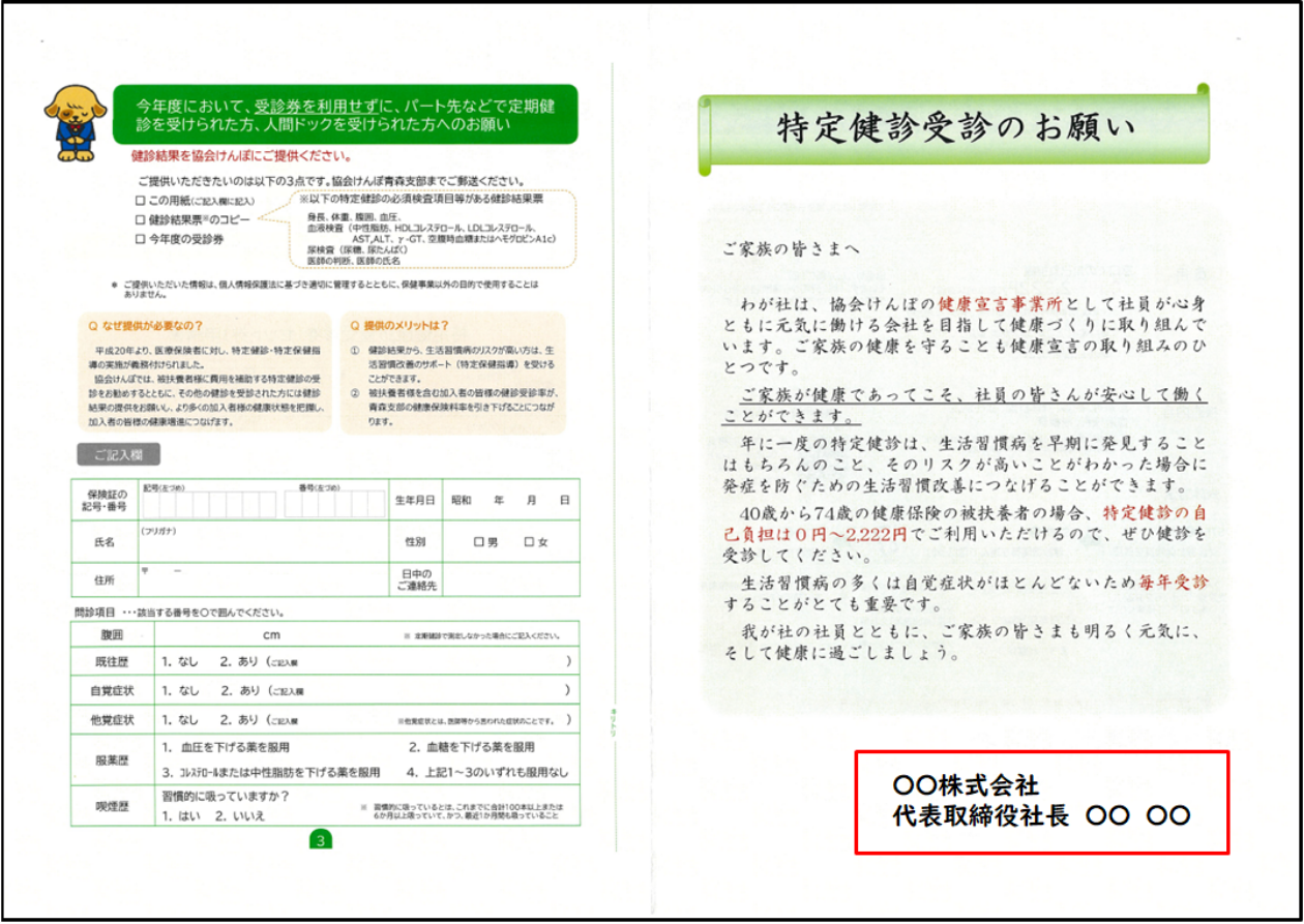 従業員の皆様を通じて配布いただくなど、特定健診の受診勧奨をお願いします。(当リーフレットは、事業所様の代表者名等を印字または押印してご利用いただくことを想定しております。掲載しております画像を参考にご利用ください。)