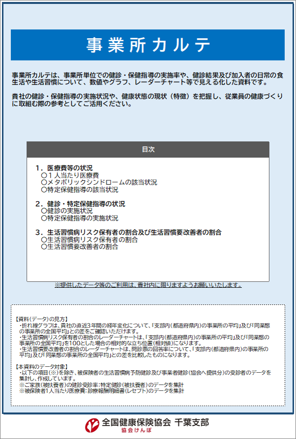 健診結果や医療費等について事業所ごとにまとめた冊子を送付いたします。