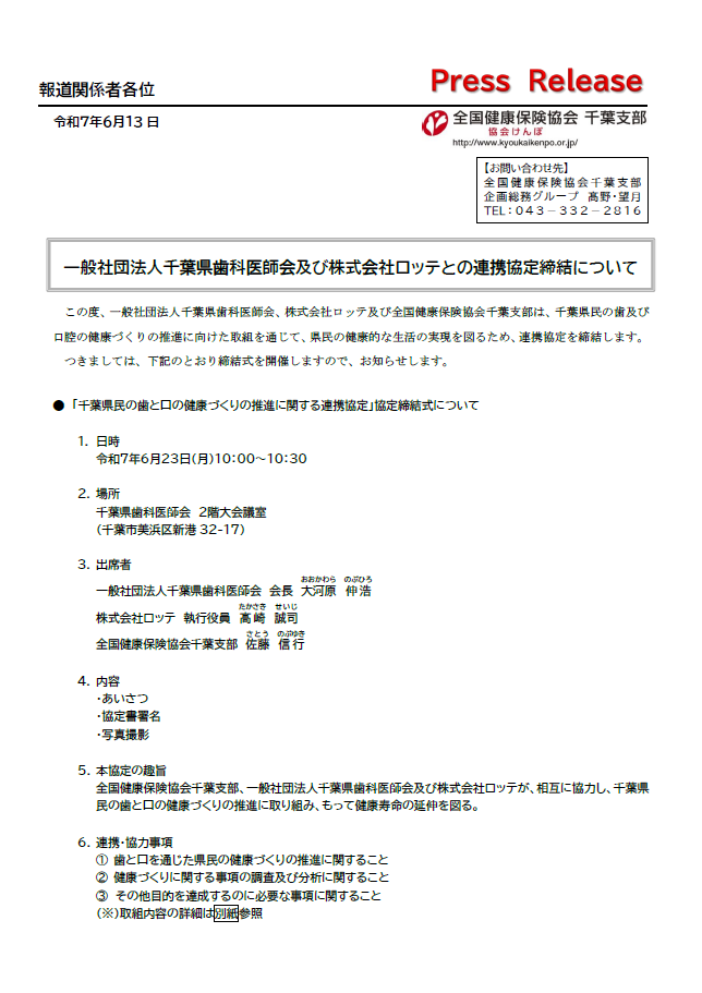 一般社団法人千葉県歯科医師会及び株式会社ロッテとの連携協定締結について、プレスリリースを行いました。(画像クリックで拡大します)