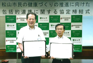 令和2年9月2日、協会けんぽ愛媛支部は、松山市と「松山市民の健康づくりの推進に向けた包括的連携に関する協定」を締結しました。