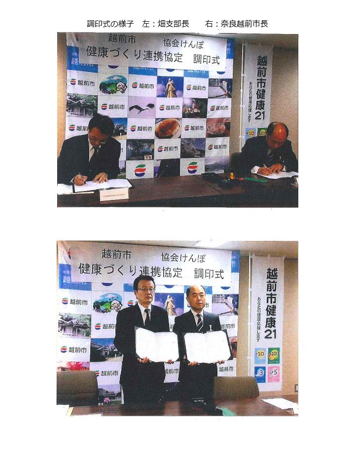 平成27年11月19日、協会けんぽ福井支部は、越前市と事業連携に関する協定を締結しました。