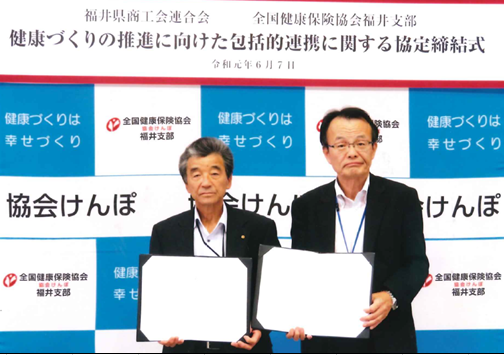 令和元年6月7日、協会けんぽ福井支部は、福井県商工会連合会と事業連携に関する協定を締結しました。