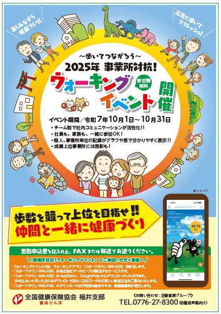 協会けんぽ福井支部では、このたび、事業所の健康づくりの促進と社内コミュニケーションの活性化を図ることを目的に、健康保険委員が在籍している事業所様を対象にウォーキングイベントを開催いたします。