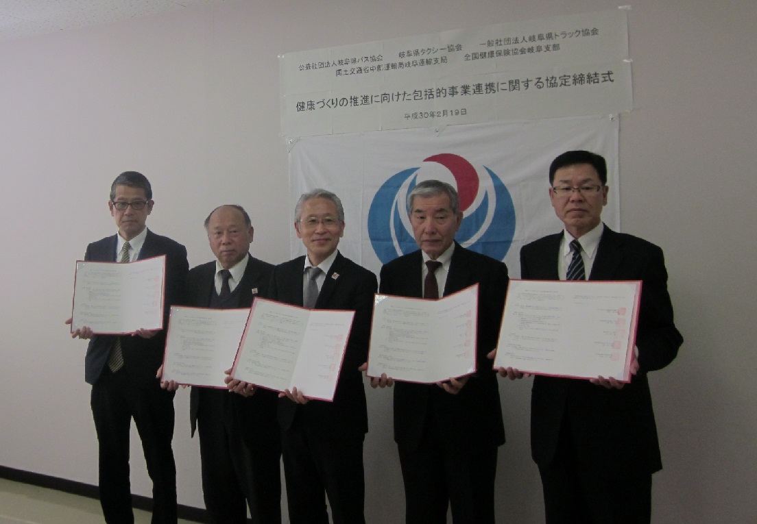 平成30年2月19日、協会けんぽ岐阜支部は、国土交通省中部運輸局岐阜運輸支局、公益社団法人岐阜県バス協会、岐阜県タクシー協会、一般社団法人岐阜県トラック協会と「自動車運送事業者の健康づくり推進に向けた包括的事業連携に関する協定」を締結しました。