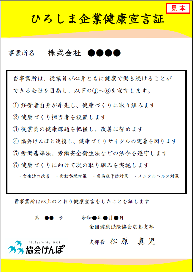 その後、協会けんぽ広島支部より「ひろしま企業健康宣言証」を交付いたします。また、当ホームページにて、事業所名を公表させていただきます。