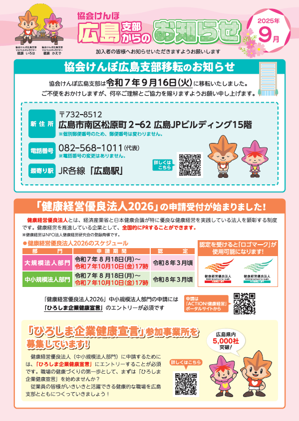 令和7年9月 | ・協会けんぽ広島支部移転のお知らせ ・「健康経営優良法人2026」の申請受付が始まりました 「ひろしま企業健康宣言」参加事業所を募集しています! ・マイナ保険証をお持ちでない方へ「資格確認書」を送付します ・令和7年度被扶養者資格再確認のご協力のお願い ・電子処方箋を使ってみませんか? |