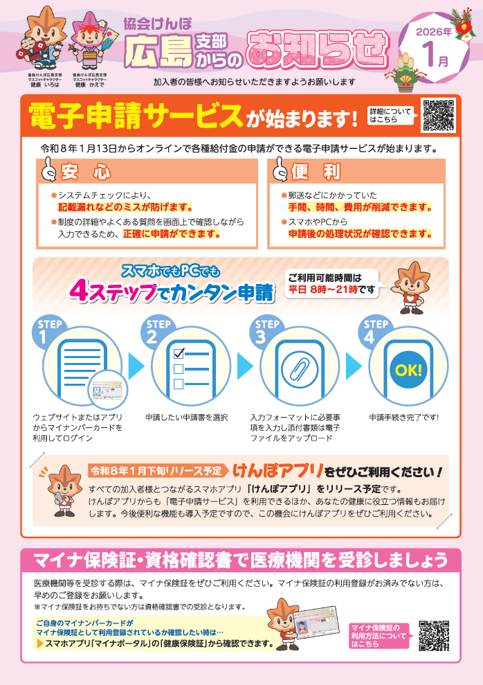令和8年1月 | ・電子申請サービスが始まります! ・けんぽアプリをぜひご利用ください ・マイナ保険証、資格確認書で医療機関を受診しましょう ・令和8年度から生活習慣病予防健診が変更されます! ・人間ドック健診補助が始まります! ・令和8年度の健診のご案内をお送りします ・ひろしま企業健康宣言 エントリー募集中 ・協会けんぽ広島支部 LINE公式アカウントを開設しています! |