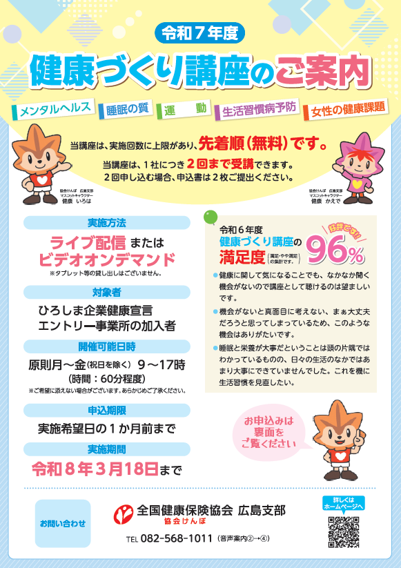 協会けんぽ広島支部では、「ひろしま企業健康宣言」にエントリーいただいている事業所様を対象に、健康づくり講座を無料で実施しております。