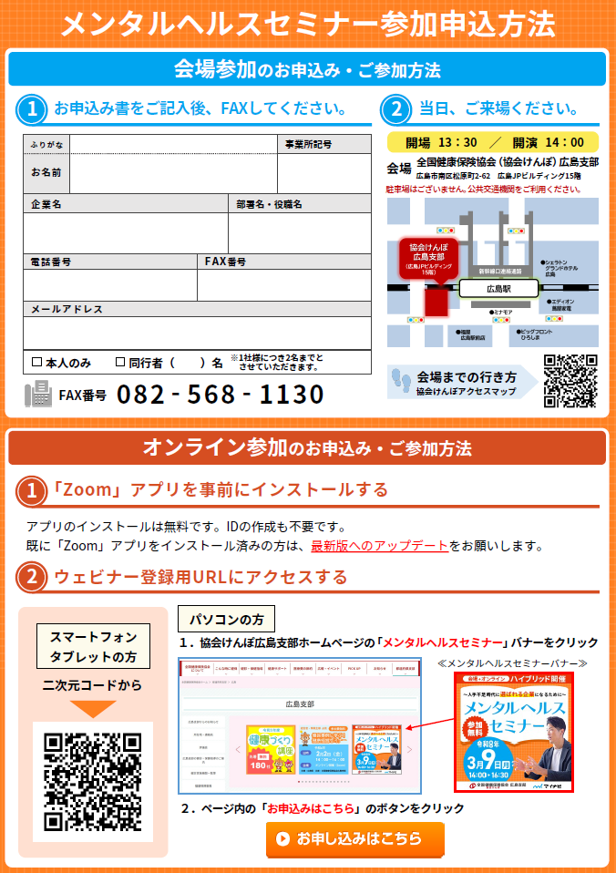 上記案内チラシを印刷し、必要事項を記入のうえ協会けんぽ広島支部までFAXにてお申込みください。(FAX:082-568-1130)