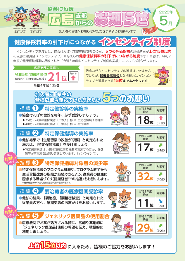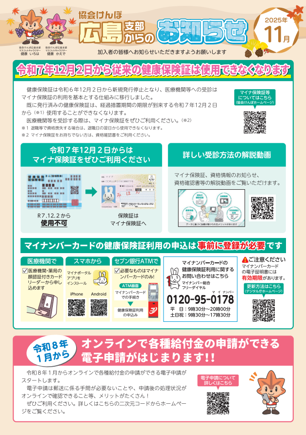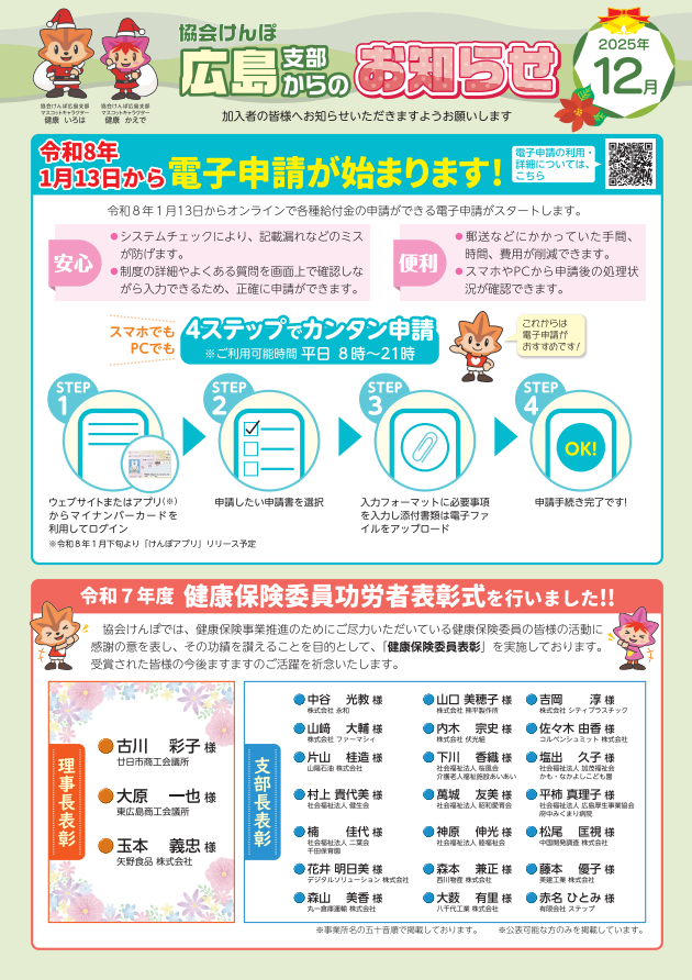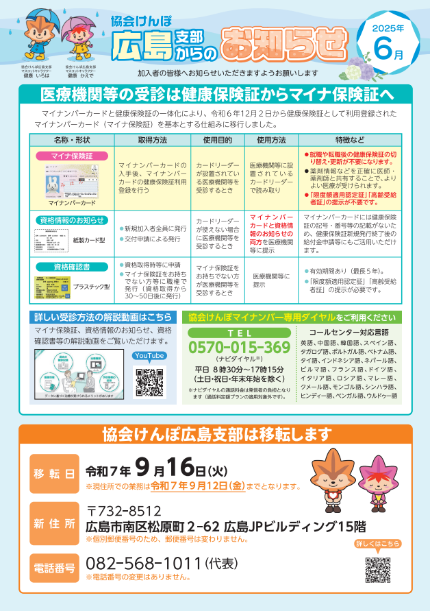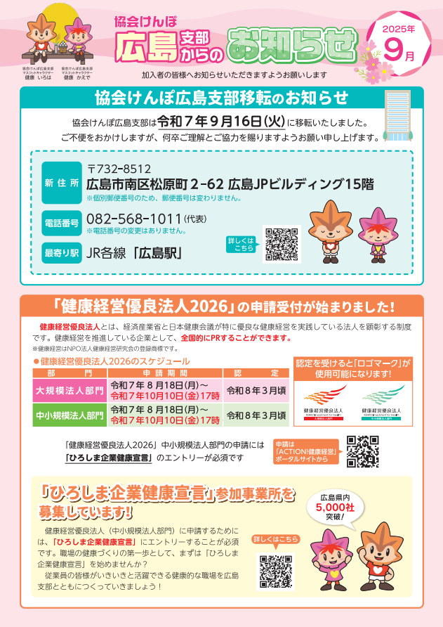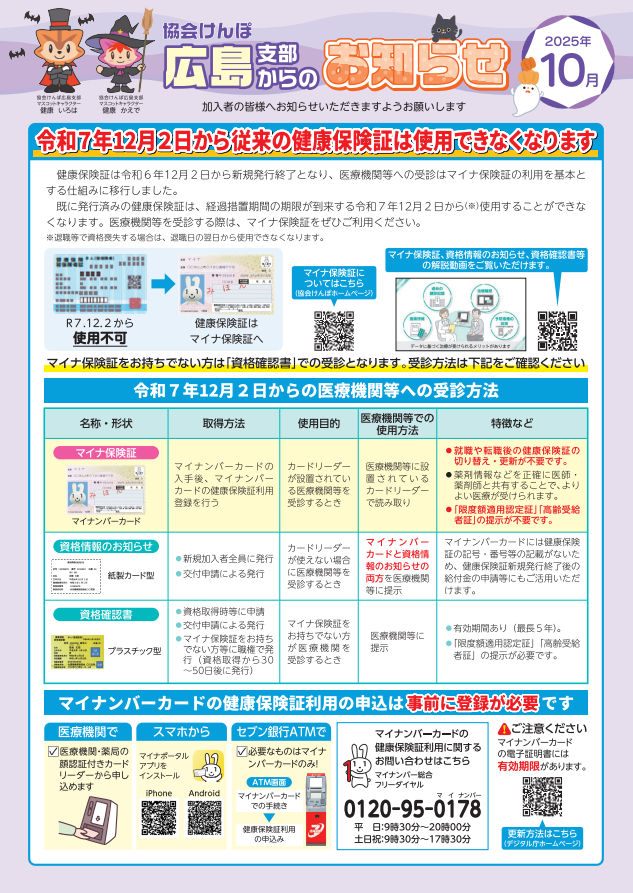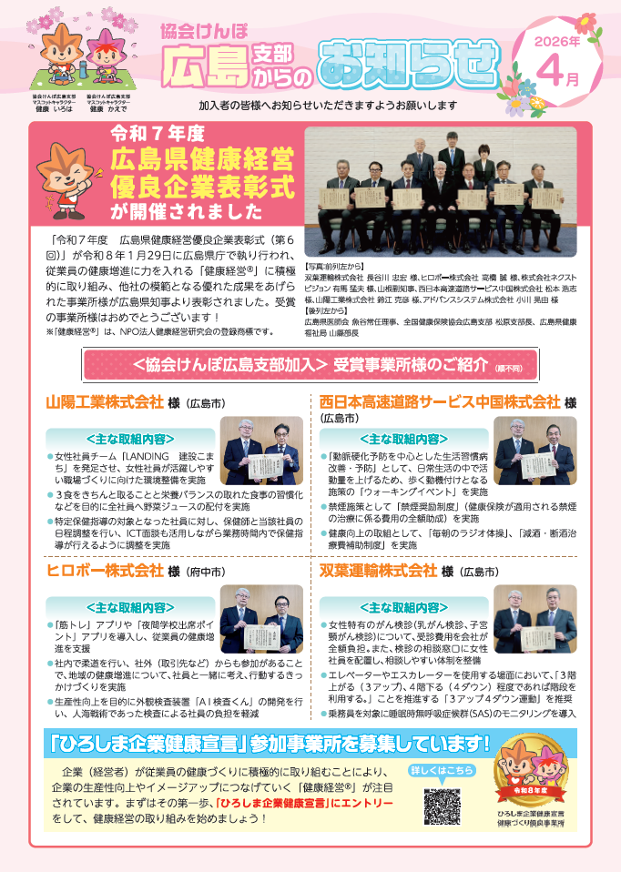 「協会けんぽ広島支部からのお知らせ」は、広島支部にご加入いただいている事業主様あてに送付しております。