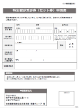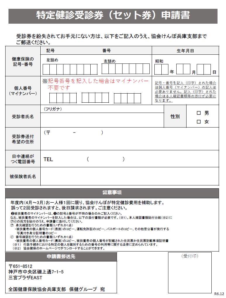 「紛失して見当たらない」等で、お手元に特定健診受診券が見当たらない方は、「特定健診受診券(セット券)申請書」をご記入のうえ、協会けんぽ兵庫支部までご郵送ください。