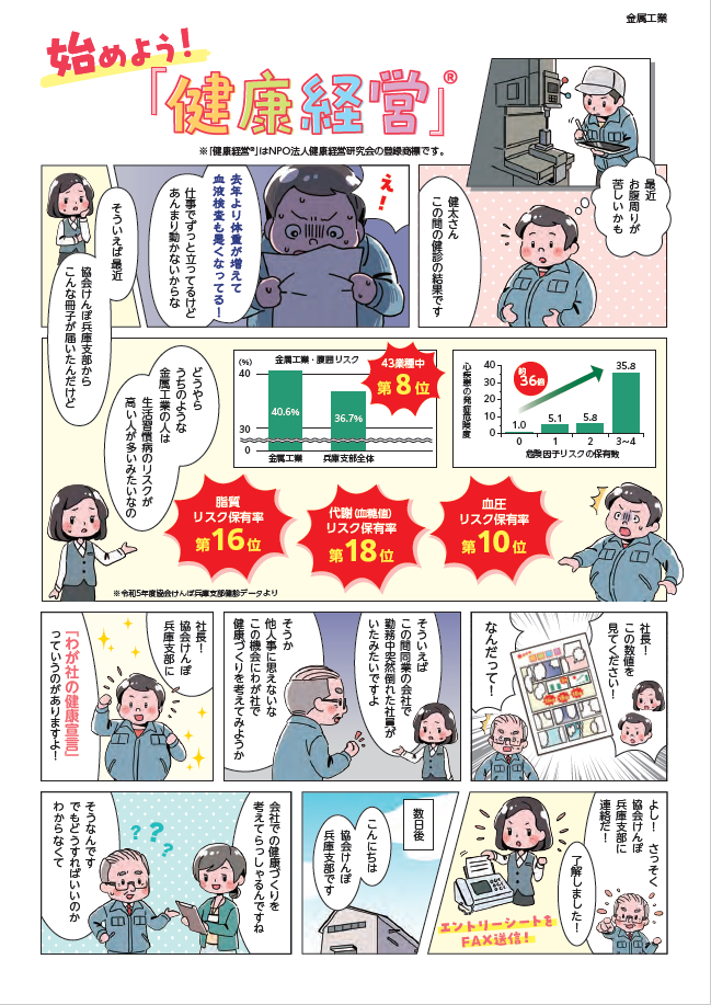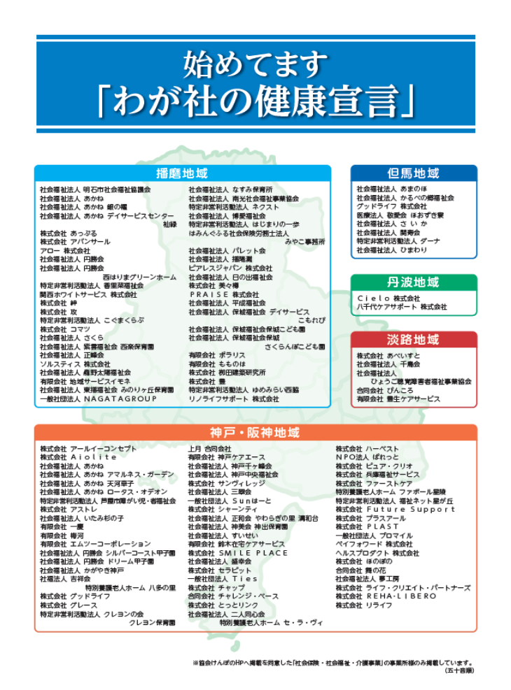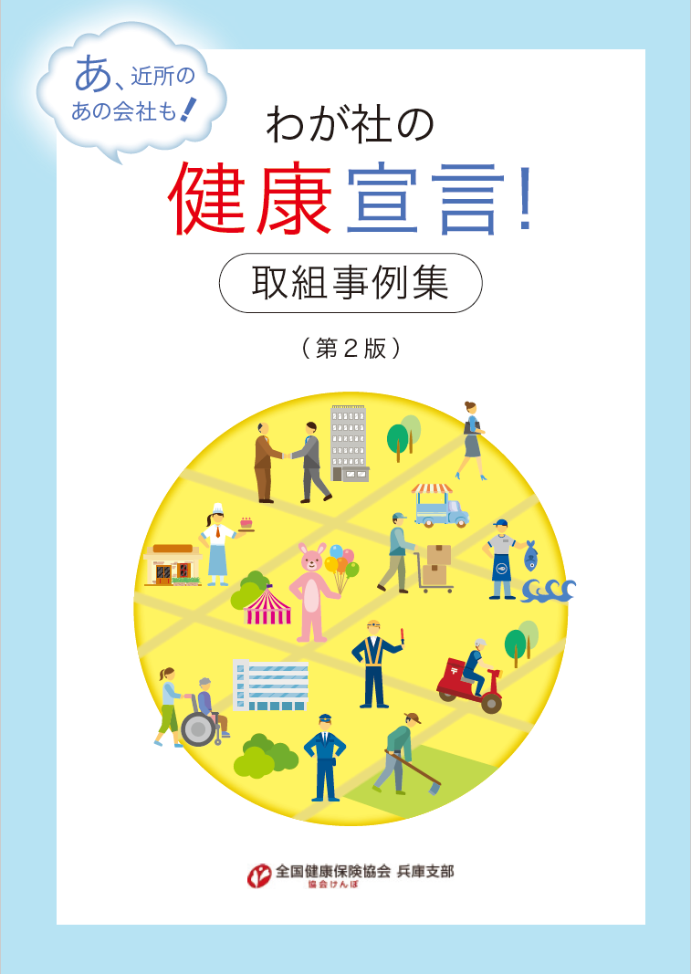 協会けんぽ兵庫支部では、「わが社の健康宣言」を実施されている事業所様の健康づくりに関する取り組みをまとめた「わが社の健康宣言!取組事例集」を作成しました。