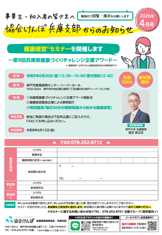 - 令和5年5月号より、タイトルを「兵庫つうしん」から「協会けんぽからのお知らせ」に変更しております。