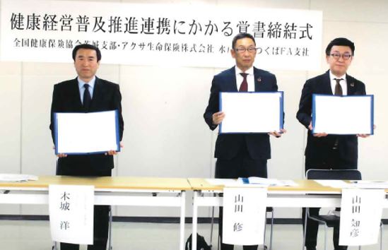 相互に協力・連携し、協会けんぽ茨城支部が実施する「健康づくり推進事業所認定制度」をはじめとする「健康経営の普及促進」事業の周知・広報等を行い「健康経営」に取り組む事業所の拡充を図ることを目的とする。