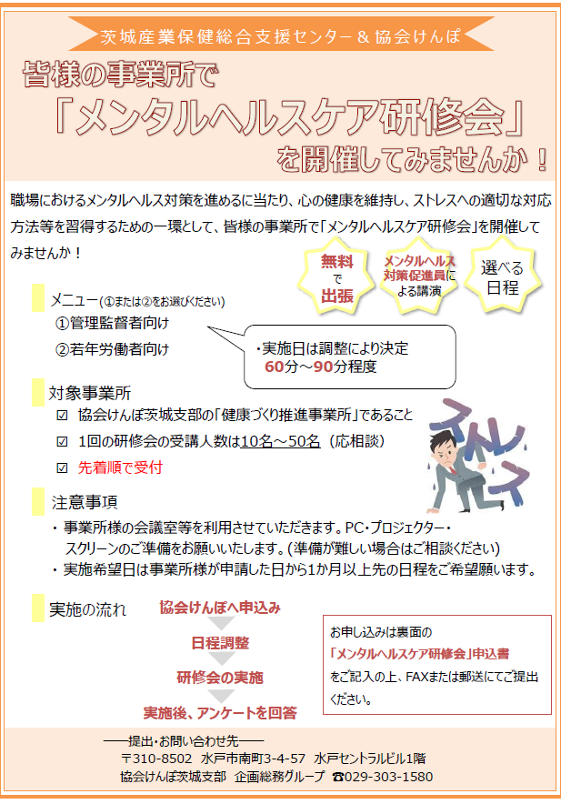 皆様の事業所で茨城産業保健総合支援センターによる研修会を開催してみませんか?