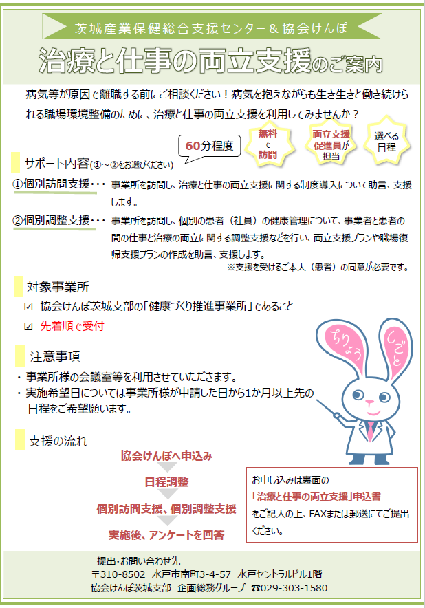 茨城産業保健総合支援センターによる治療と仕事の両立支援を利用してみませんか?