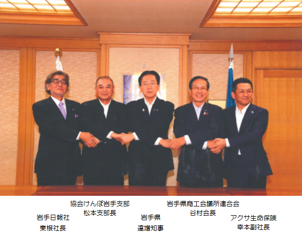 平成30年8月6日、協会けんぽ岩手支部では、岩手県・岩手県商工会議所連合会・株式会社岩手日報社・アクサ生命保険株式会社と「健康経営の推進に係る連携協定」を締結しました。