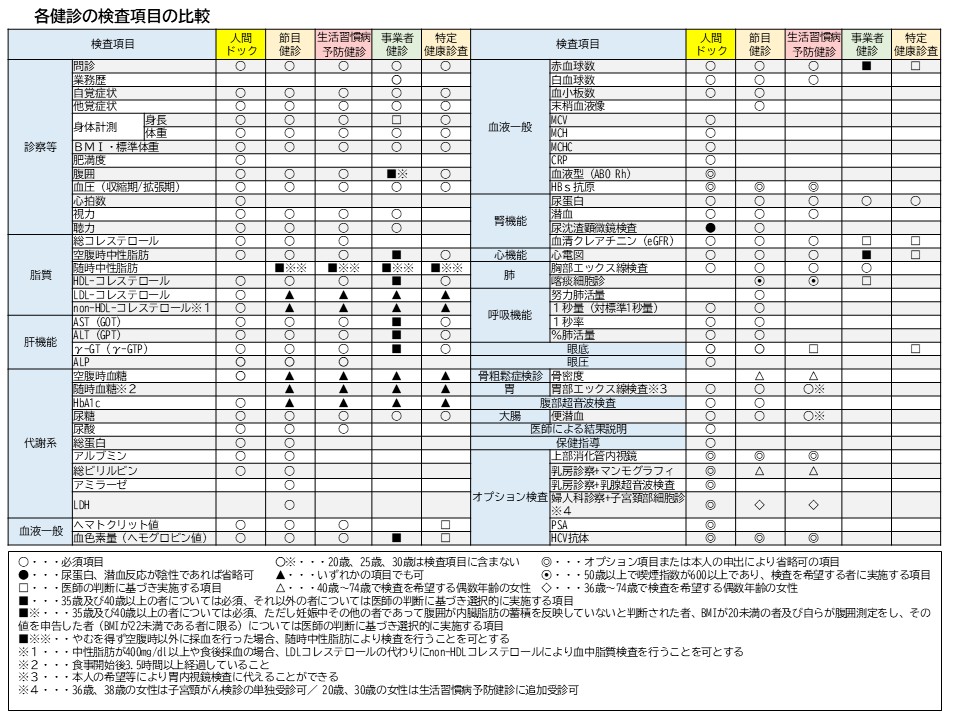 令和8年度から始まる生活習慣病予防健診(一般健診、節目健診)と人間ドック健診の検査項目比較表です。