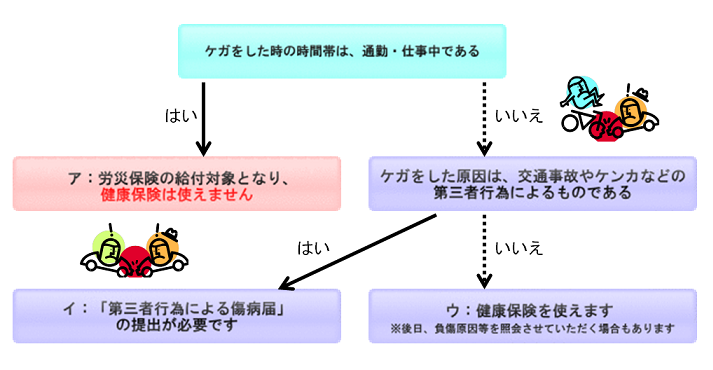 交通事故、ケンカ、他人の飼い犬等にかまれたときなど第三者の行為によって起こったケガや病気でも、健康保険を使った治療を受けられます。