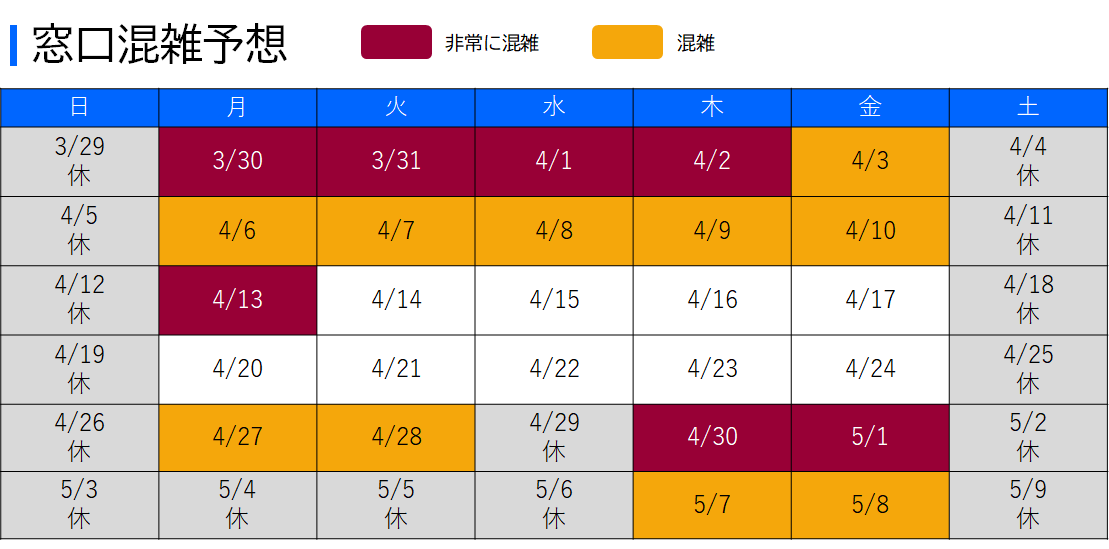 毎年3月下旬から5月にかけて窓口が大変混雑するため、お待たせする時間が長くなります。