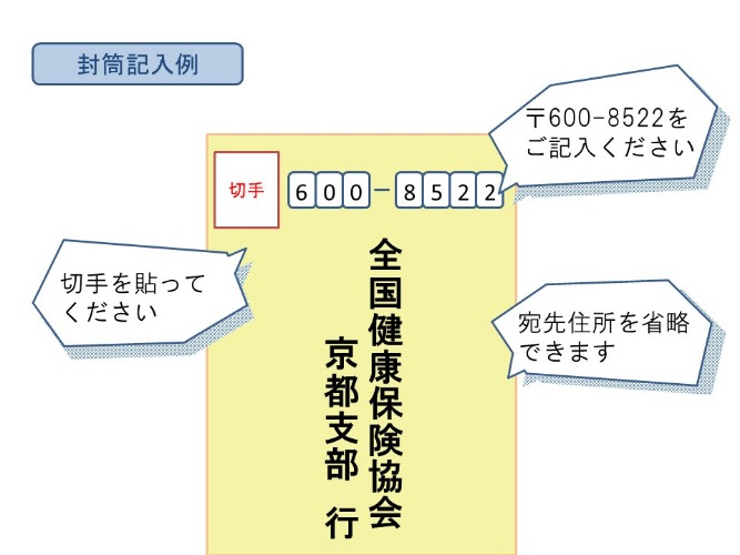 郵便番号「〒600-8522」は、全国健康保険協会京都支部の個別番号であるため、宛先住所の記入を省略しても、この郵便番号と宛名のみで郵便物が届くようになっております。