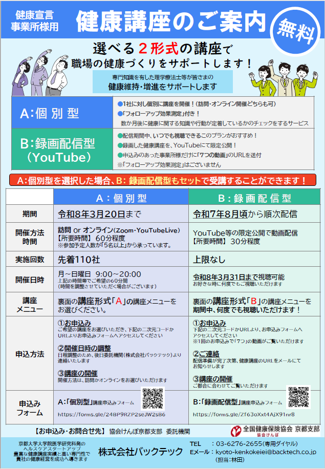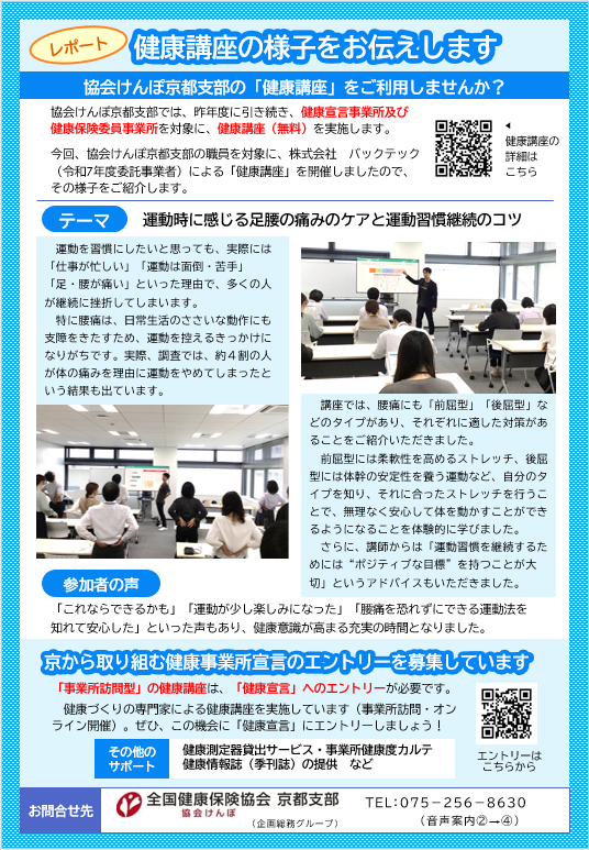 協会けんぽ京都支部では、「京から取り組む健康事業所宣言エントリー事業所」「健康保険委員にご登録されている事業所」様を対象に、健康講座を無料で実施しております。