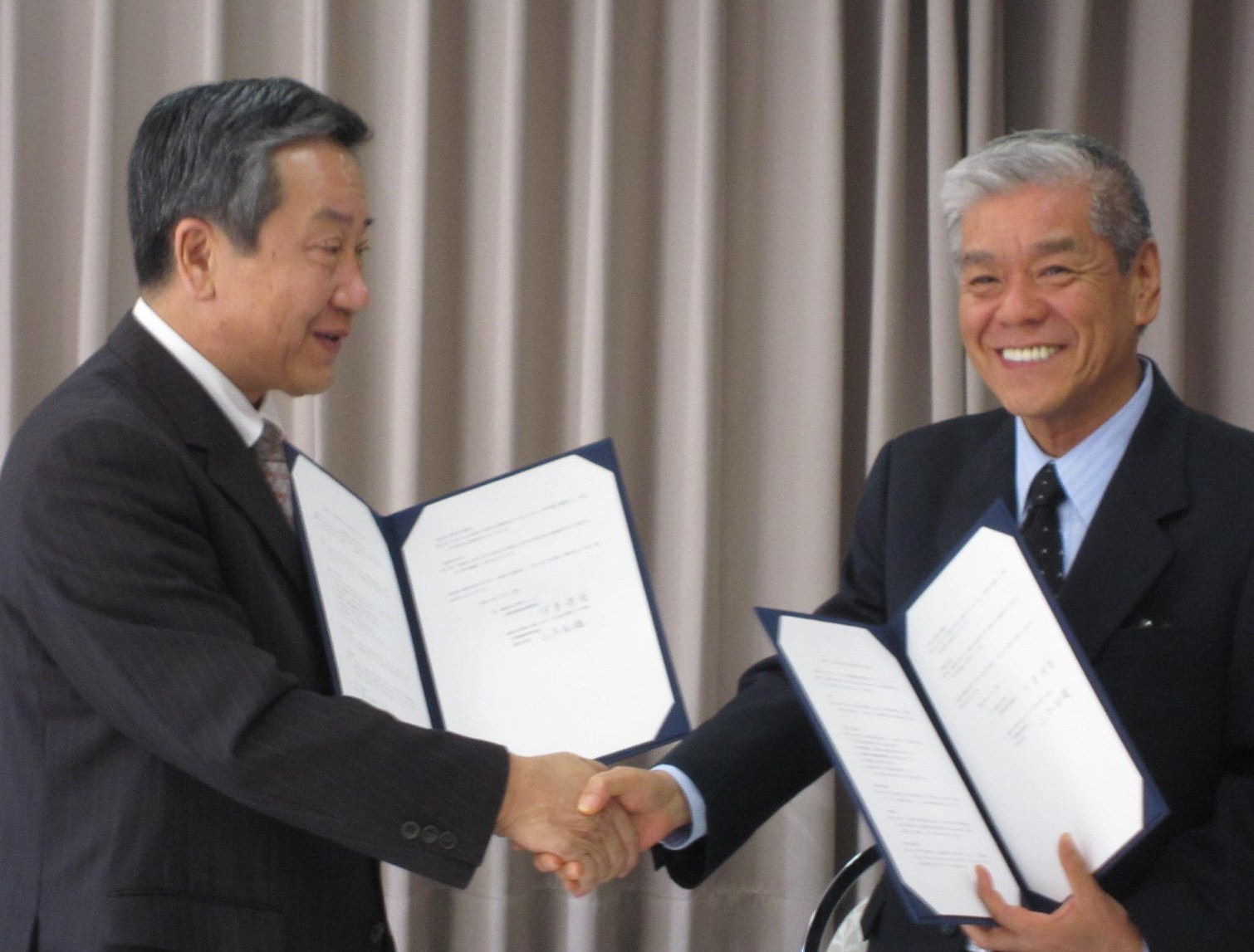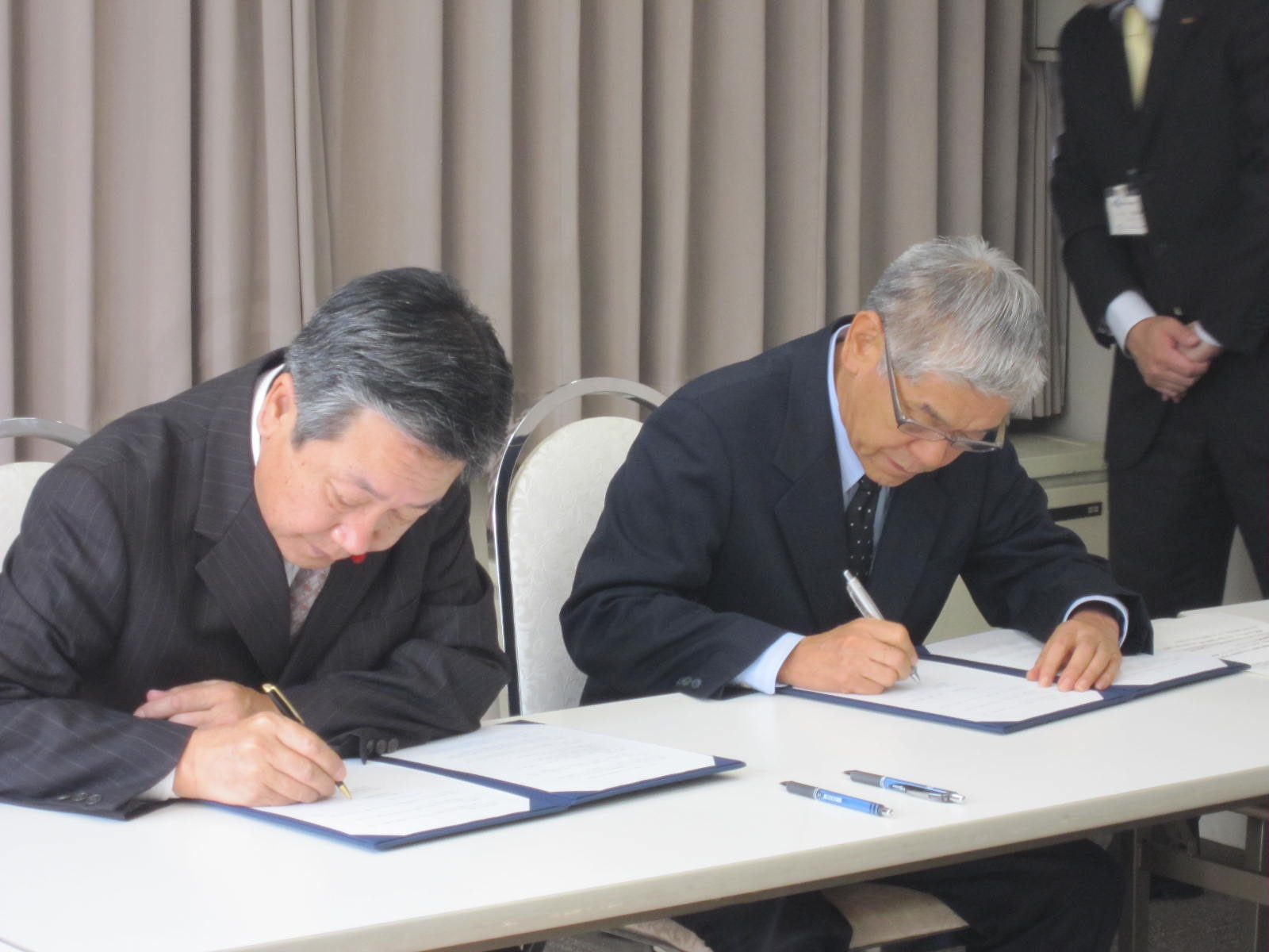 署名を行う長崎県の伊東福祉保健部長(左)と山本支部長