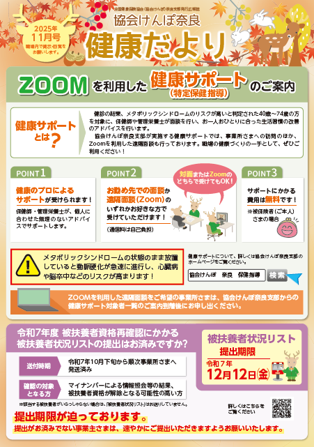 | ・令和7年度健診のご案内をお送りします ・協会けんぽ奈良支部LINE公式アカウント友だち募集中!!
