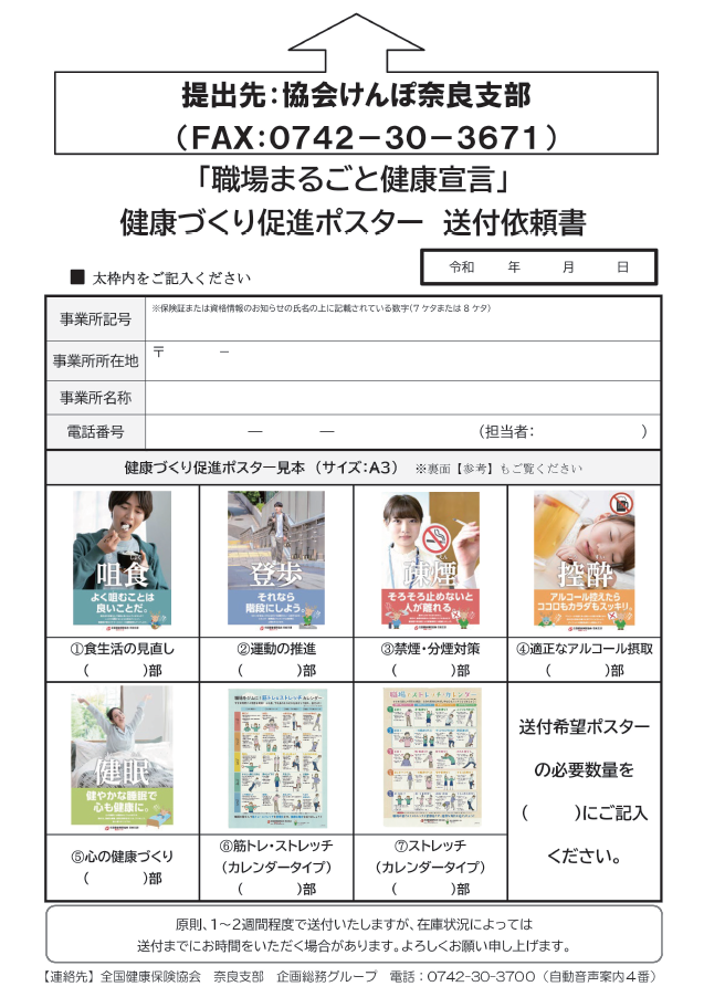 健康づくり促進ポスターをご希望の場合は、依頼書に必要事項をご記入の上、協会けんぽ奈良支部までFAXでお送りください。