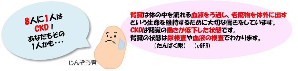 健診の結果、CKD(慢性腎臓病)の進行が疑われる方に、医療機関への受診勧奨のお手紙を送付しています。定期的に医療機関を受診している方でも、1年ほど尿・血液検査をしていない方には、検査のお勧めのためお手紙を送付することがあります。