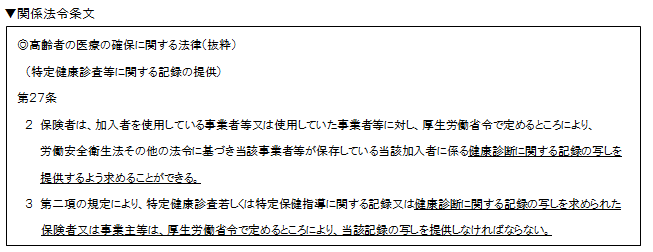 定期健康診断結果データの提供は、「高齢者の医療の確保に関する法律」に定められているため、事業主が責任を問われることはございません(下記の関係法令条文等をご確認のうえ、ご協力をお願いします)。