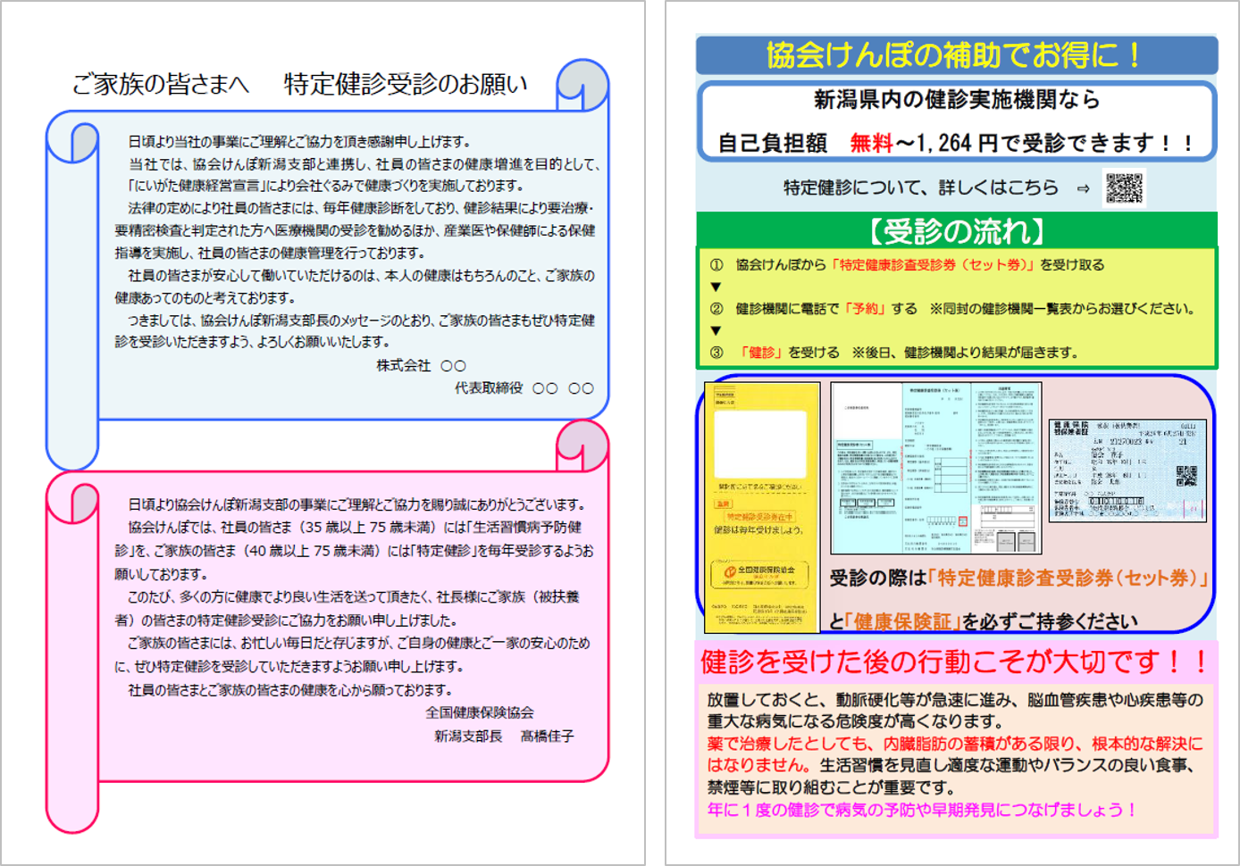特定健診をより多くの方に受診いただくために、被扶養者(ご家族)様を対象とした「特定健診受診のお願い」文書を作成いたしましたので、ご協力をお願いします。