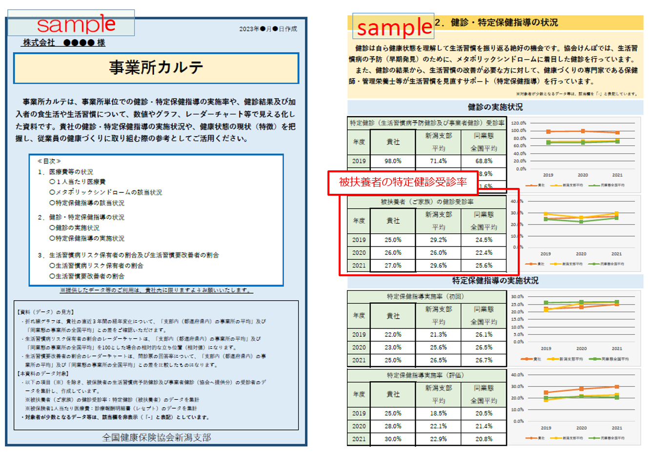 事業所カルテは、従業員様の健診結果から事業所の健康度を見える化したもので、新潟県平均と比較した健康度のリスクを見ることができるものです。新潟支部では事業所カルテを使って、事業所の健康づくりをサポートする「にいがた健康経営宣言」を行っています。
