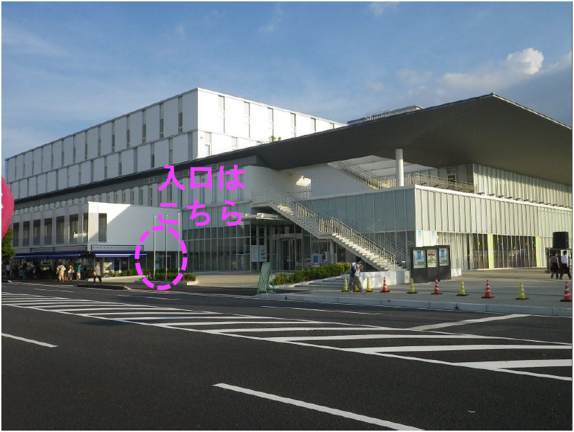 東側駐輪場をご利用の際は、近くにJ:COM ホルトホール大分の入口がございますので、そちらからお入り下さい(写真の中央奥の警備員さんが立っている左奥にございます)。