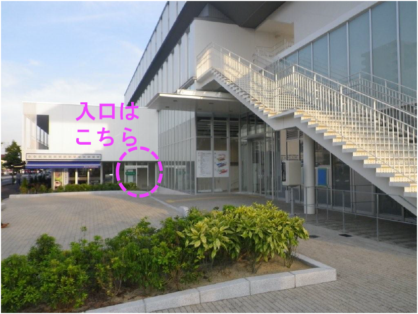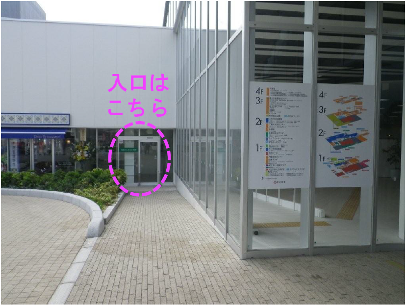南側の駐輪場をご利用された場合は、駐輪場を右手に見ながら進んで頂き、J:COM ホルトホール大分の西側に回っていただきますと入口がございますので、そこから一旦J:COM ホルトホール大分の中を通り、協会けんぽ大分支部までお越しください。